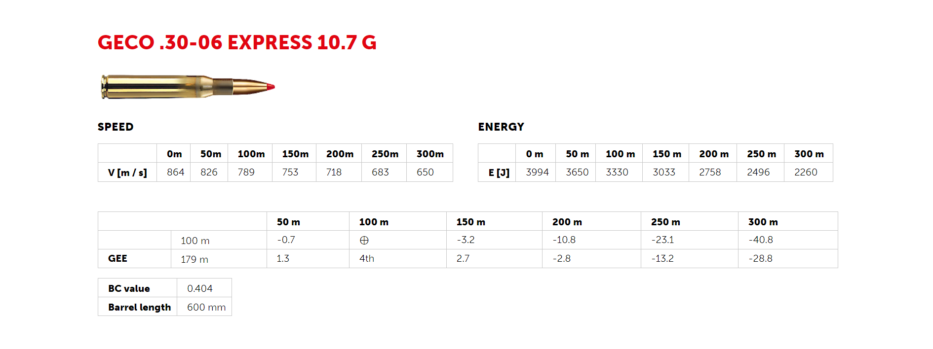 GECO Express streljivo ima vrlo položenu putanju, visoku izlaznu brzinu te brzo prenosi energiju kod pogotka. Aerodinamičan oblik zrna zajedno s GECO Express plastičnim vrhom daju položeniju putanju zrna te smanjuju grešku pri korekciji točke ciljanja s obzirom na udaljenost mete.